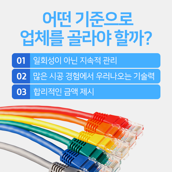 만족할 수 있는 공사, 오랜기간 사용해도 문제 없는 랜공사를 경험하기 위해서는 일정 기준을 가지고 업체를 선정할 필요가 있습니다. 그 기준은 바로 아래와 같습니다.