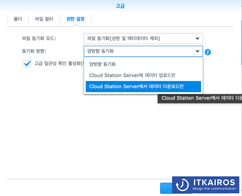 3) Cloud Station Server에서는 동기화를 허용할 공유 폴더를 설정하고 Cloud Station ShareSync에서는 서버가 허용한 폴더를 선택 후 동기화 옵션을 지정하면 됩니다^^