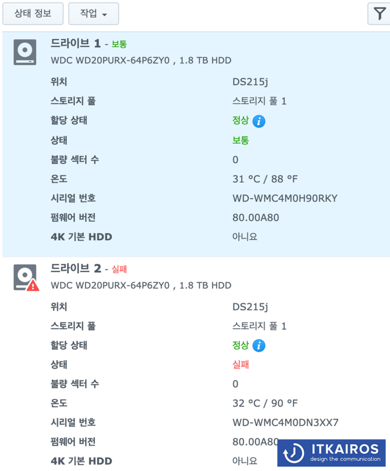 하드디스크를 교체하기 위해서 드라이브 1, 드라이브 2의 슬롯 번호를 확인하거나 보다 정확하게 하기 위해 하드디스크 시리얼 번호를 비교하여 문제의 하드디스크를 제거 후 동일 제조사의 동일 모델로 교체하는 게 좋겠습니다.