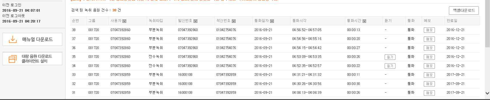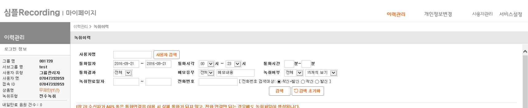 - 홈페이지에서 녹취파일 듣기/다운로드/통화메모 가능