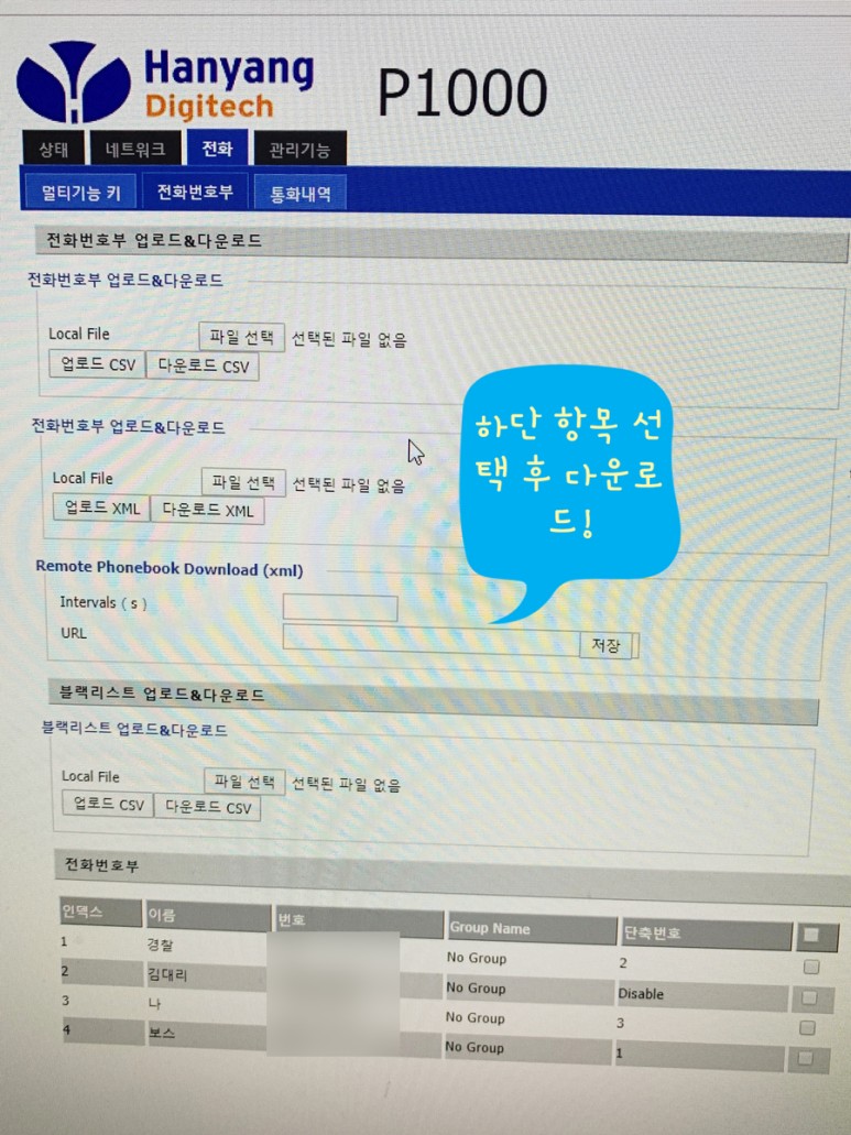 일일히 이전할 필요없이 엑셀로 업로드하여 변경한 키폰전화기에 다운로드로 옮기기만 하시면 되는데요.