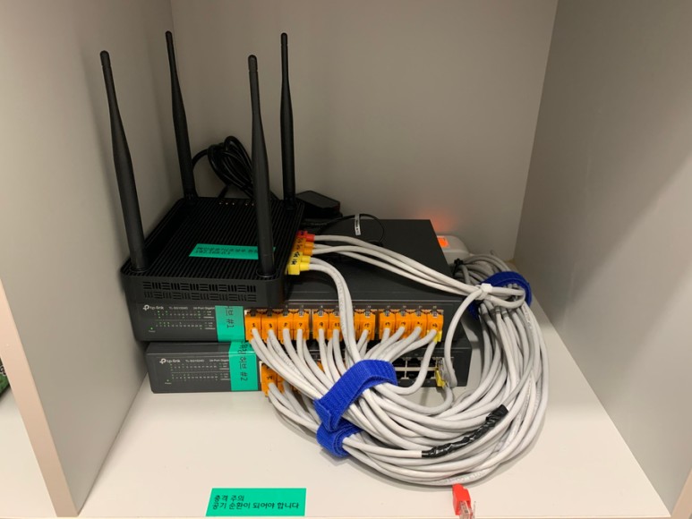 공유기와 허브 설치 후 허브에서 뻗은 엔드포인트를 찾아 각 랜선마다 네이밍 해드리고, 각 장바의 라벨프린터기를 이용하여 구분 편하도록 하였습니다. 또한 키폰 설치시 원하시는 내선번호 설정 모두 저희가 도와드리고, 사용법에 관한 내용 모두 친절히 알려드렸습니다.