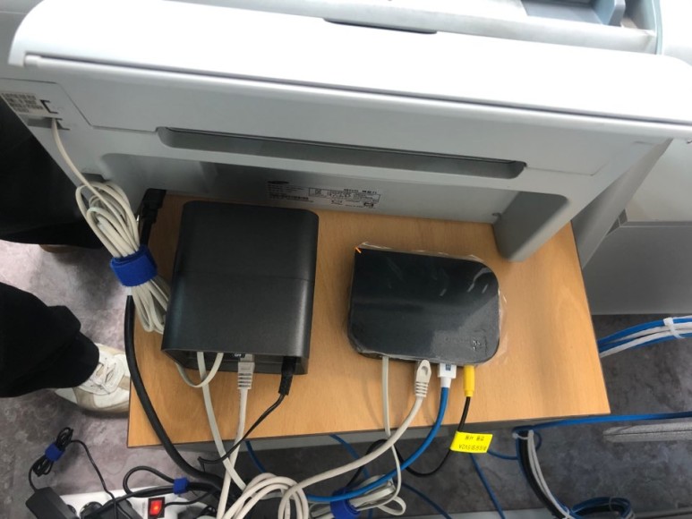마무리 설명드리며, FAX 뒤편 정신없이 어지럽혀져 있던 선들을 말끔히 정리해리고, 각 자리에 있던 프린터기들을 연동하지 못하시어 저희가 모두 가능하도록 기술지원하여 드렸습니다.