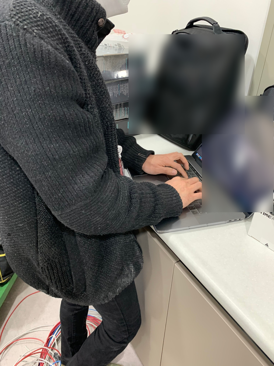 이렇게 시설된 장비들은 모두 라벨링하여 유선상으로도 어떠한 장비가 문제가 있는지 빠르게 파악하고, 추후에 다른 전문가가 보기에도 가시적 보기 좋아 문제해결에 용이합니다. 저희 팀장님께서 설정을 위해 노트북을 만지고 계시네요. 화이팅!