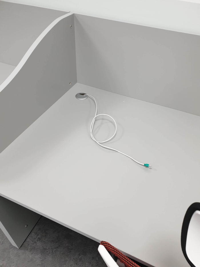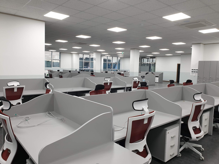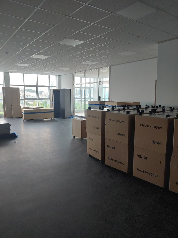 저희가 첫 방문 시보다 공사가 많이 진행된 모습입니다. 책상이 배치가 완료된 뒤에 저희가 각 자리로 랜선을 포설공사를 시작하게 됩니다.