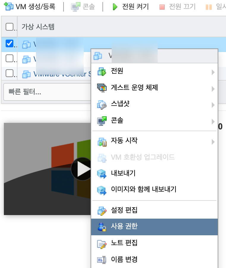 2) 만약 특정 VM만 특정 사용자에게 권한을 주고 싶다면 VM 리스트에서 우측 마우스를 눌러 사용권한을 설정하면 됩니다.