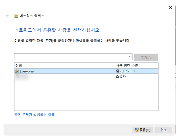 everyone 사용자 추가 후 > 읽기/쓰기 권한으로 변경 > 공유 클릭