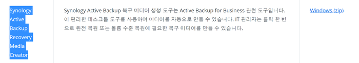 > Synology 홈페이지 다운로드 섹션에서 복구 미디어 생성 도구를 다운로드합니다.