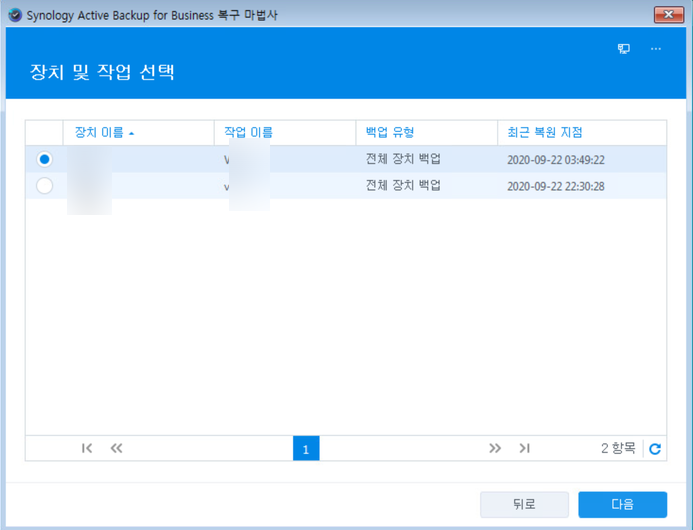 나스에 백업된 백업본 리스트가 표시됩니다. 복구를 원하는 이름을 선택