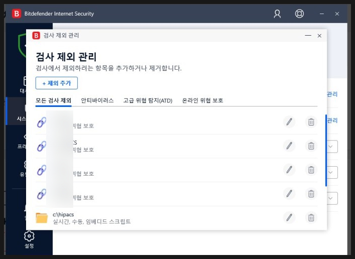 비트디펜더에서 바이러스 검사를 예외 처리할 폴더를 지정하는 방법입니다.