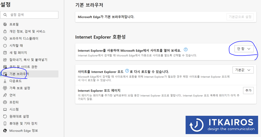 엣지 실행 > 우측 상단 점세 개 > 설정 > 기본 브라우저 > 'Internet Explorer를 사용하여 Microsoft Edge에서 사이트를 열어보세요.' 안 함으로 선택