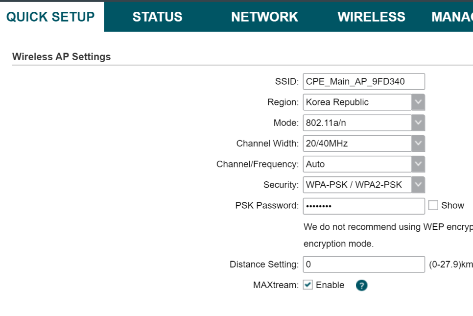 1) 메인 CPE 설정(AP 모드) :