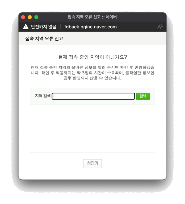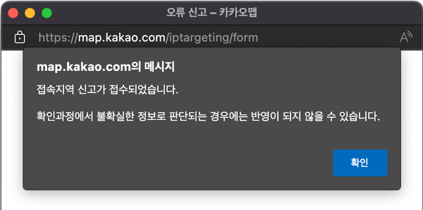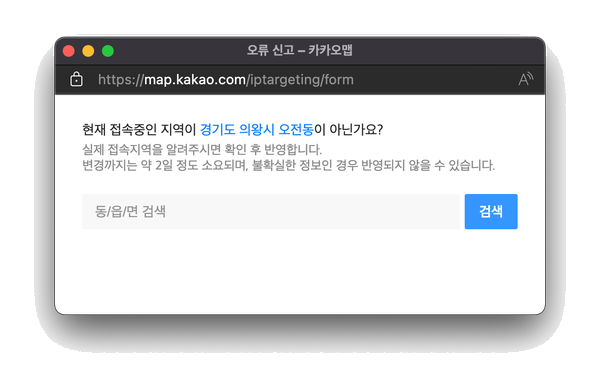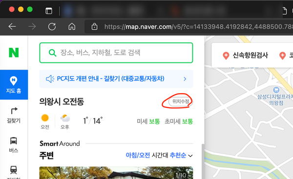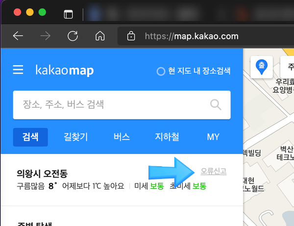 그럴 경우 아래 이미지를 참고하여 위치 수정(오류 신고) 버튼을 눌러 수정하시면 됩니다.
