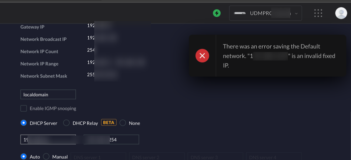 오류메시지 : There was an error saving the Default network "ip addr" is an invalid fixed IP.