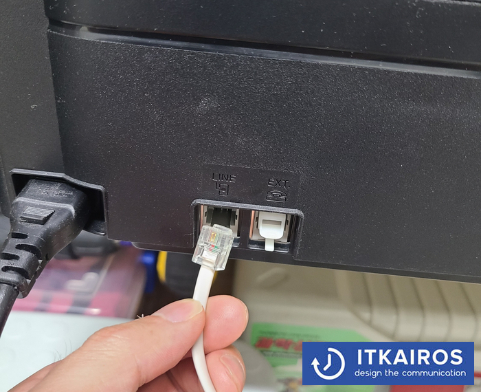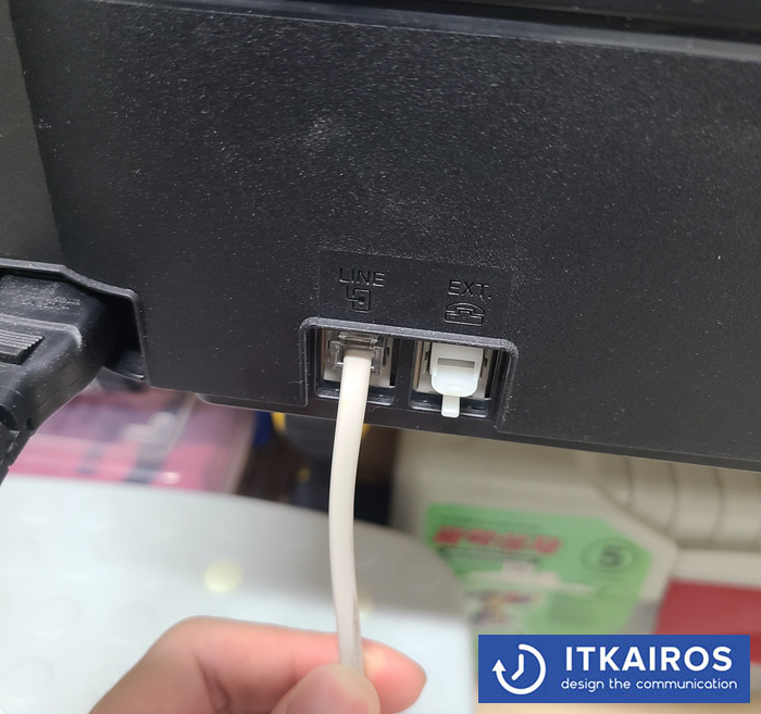 3) 팩스기기 쪽을 보면 LINE 포트에 팩스선을 연결합니다. (EXT에 연결하지 말아주세요.)
