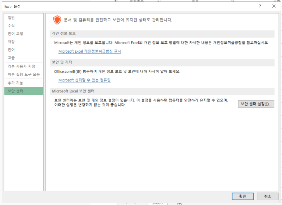엑셀 > 파일 > 옵션 > 보안센터 > 보안 센터 설정