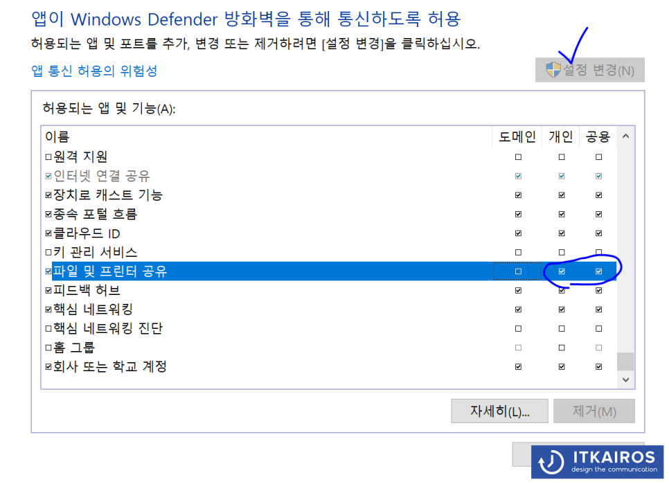 설정 > 네트워크 및 인터넷 > Windows 방화벽 > 방화벽에서 앱 허용 > 파일 및 프린터 공유 > 개인/공용에 체크