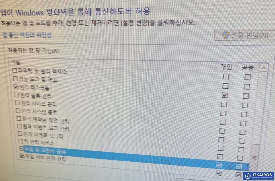 아래 파일 및 프린터 공유 관련 허용 처리
