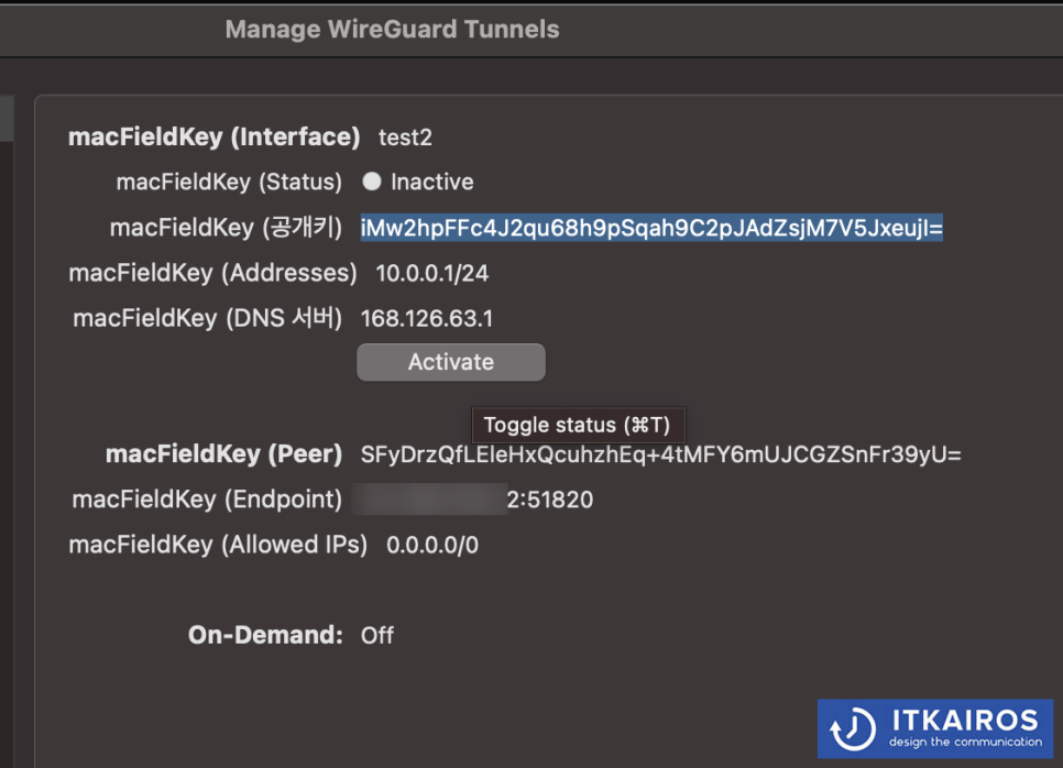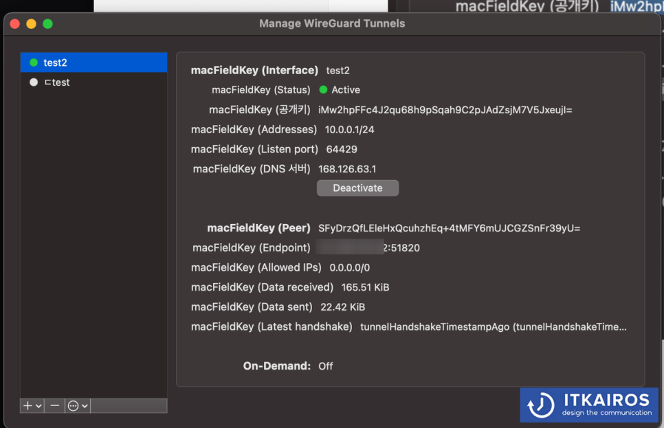 Endpoint = 120.170.90.90:51820 <== 120.170.90.90은 WAN IP입니다. 본인의 WAN IP로 변경해야 합니다.