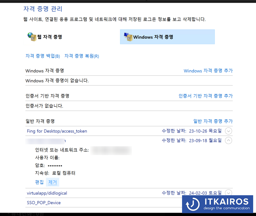 정보공유 나스 서버 공유 폴더(smb) 자동 접속 계정 비밀번호 삭제 iAdmin 2024. 2. 5. 17:54 윈도우키 누르시고 '자격'으로 검색하면 '자격 증명 관리자' 아이콘 표시됩니다. 실행해 주세요. Windows 자격 증명 클릭 후 일반 자격 증명 쪽에 나스 서버 관련 계정 삭제해 주시면 됩니다. 공유하기 게시글 관리 아이티카이로스 저작자표시 비영리 변경금지 (새창열림) '정보공유' Related Articles 윈도우 HIDPI 구형 프로그램 화면 깨짐(?) 틀어짐 해결하기 macOS에서 작성한 한글 파일명 자소 분리 이슈 해결하기(반디 네이머) CAT6 랜선만들기 (구형 /신형 8P Crimp EZ Tool / CAT.6 UTP STP EZ 전용) 핑로거, 핑로거(ping logger)