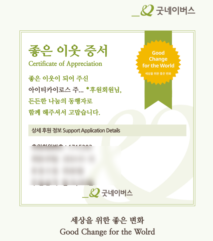 카테고리 없음 회사소개 iAdmin 2018. 6. 25. 03:03 아이티카이로스는 굶주림 없는 세상, 더불어 사는 세상을 만들기 위해 노력하는 굿네이버스를 후원하고 있습니다. 세상을 위한 좋은 변화에 동참해 보세요. https://www.goodneighbors.kr/ 공유하기 게시글 관리 아이티카이로스 저작자표시 비영리 변경금지 (새창열림)